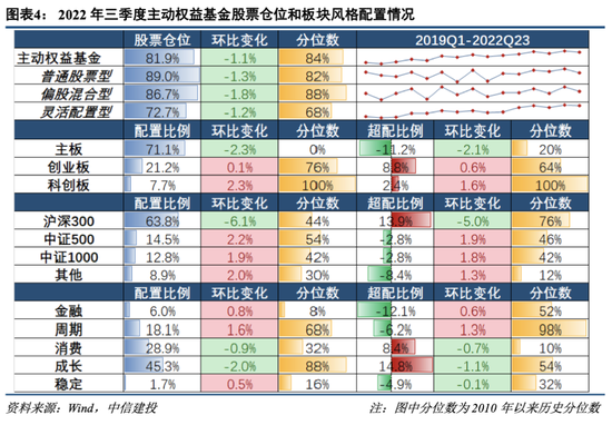 随着市场在三季度结束反弹进入调整,公募资金重回中小市值,双创板块优质个股受到青睐,科创板配置比例提升明显,但大盘成长风格股票的配置比例下滑较多,整体来看主动增配周期和金融风格板块较多。