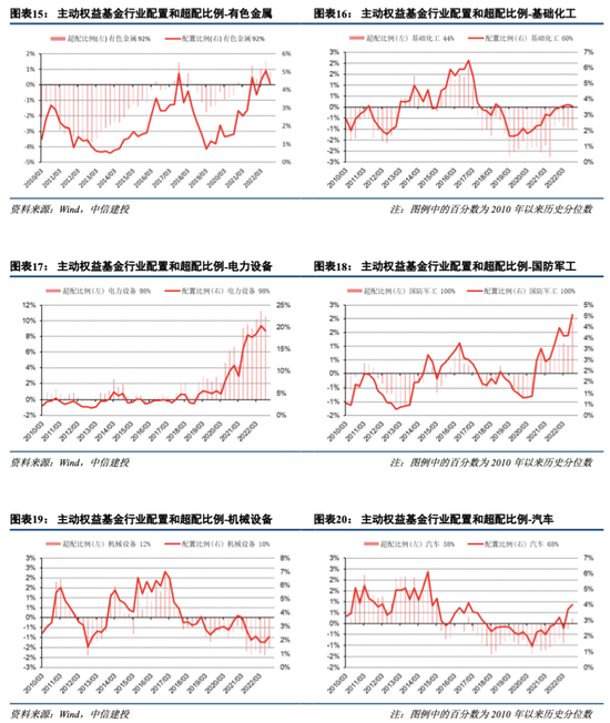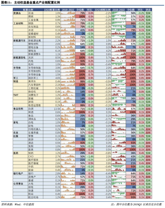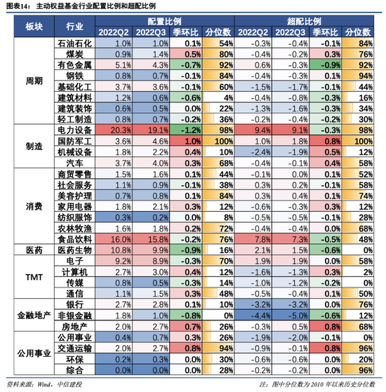 截至2022年三季度,有色金属、电力设备、国防军工、交通运输行业的配置比例,以及有色金属、钢铁、电力设备、国防军工、交通运输行业的超配比例,处于历史分位数85%上方。