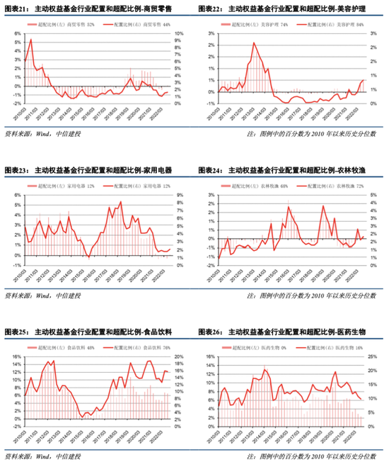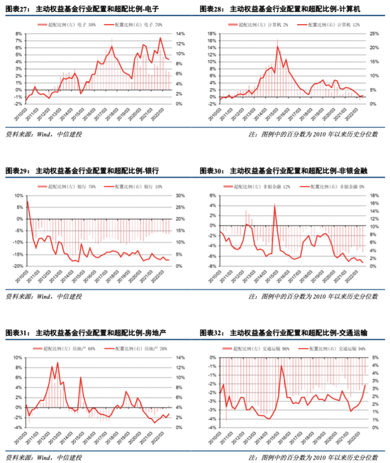 1)周期资源品:整体仍然低配,但绝对配置比例处于2019年以来较高水平,煤炭和工业金属增配明显。2)新能源汽车:绝对配比和超配比例均回落,锂电设备环节有所增配。3)新能源发电:绝对配比和超配比例继续提升,光伏增配较多,风电小幅增配。4)半导体:整体绝对配比和超配比例出现提升,材料和设备环节增配,制造环节减配。5)制造和TMT:配比变动不大,整体仍然低配,汽零配比提升,消费电子继续下滑。6)消费:整体配比不高,白酒出现减配。7)医药:绝对配比和超配比例均回落,制药和医疗器械配比提升,CXO减持明显。8)金融地产公用:配比基本全线提升,地产有所回暖。