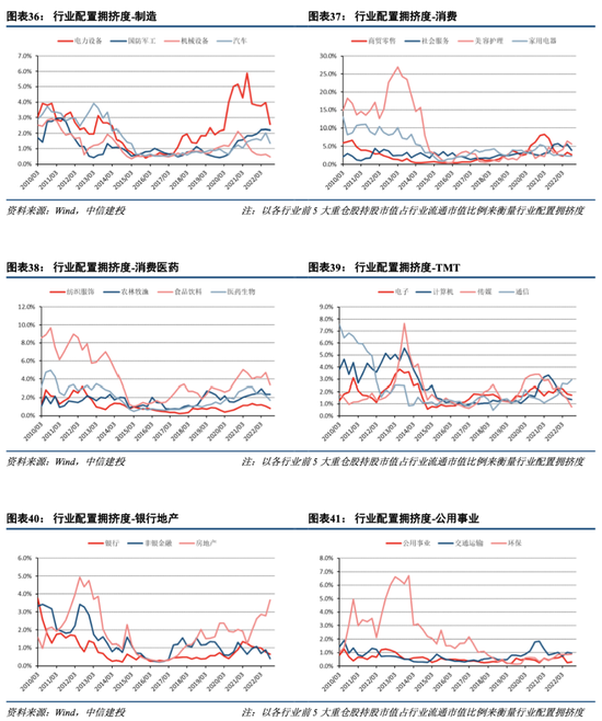以各行业前5大重仓股持股市值占行业流通市值比例来衡量行业配置拥挤度来看: