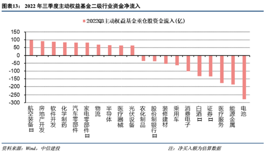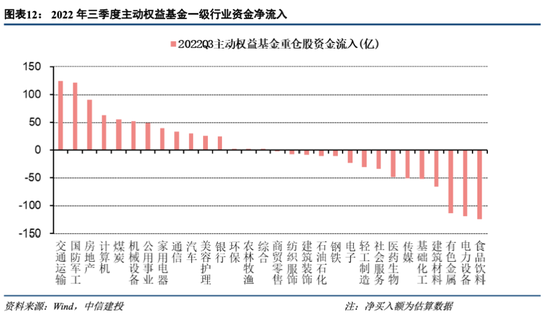 从公募资金行业流向来看,2022年三季度有超过120亿资金分别流向交通运输和国防军工行业,房地产行业的资金净流入也超过90亿。