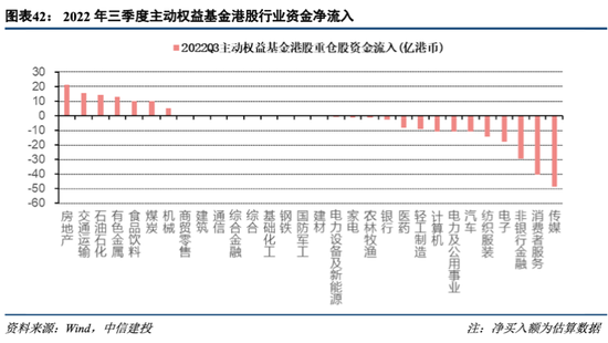 2022年三季度公募基金主要增持港股周期地产板块。房地产、交通运输、石油石化、食品饮料、煤炭、有色金属行业净流入额居前;传媒、消费者服务、非银行业遭卖出较多。
