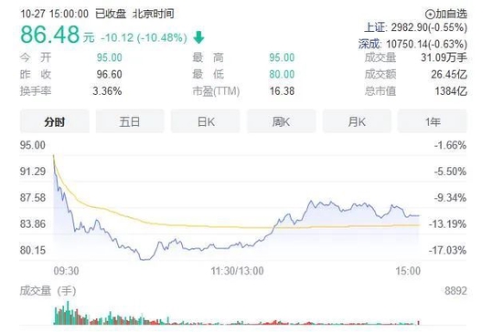 此外,智飞生物今日盘中大幅跳水,盘中一度跌超17%,收盘下跌10.48%报86.48元,当前市值1384亿元。