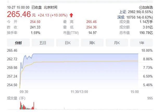 吉比特(603444)27日开盘后快速拉升封涨停,截至收盘,该股报265.46元,当前市值约190亿元。