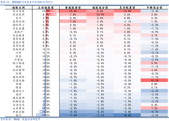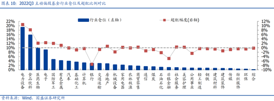 行业集中度回落,电子、医药、军工与地产超低配分歧较高。从静态持仓来看,电力设备、食品饮料、医药生物和电子仍为前四大重仓行业,但三季度行业持股集中度有所回落, Top3、Top5重仓行业集中度分别环比降低2.1%和2.5%,与2022年一季度末水平大致相当。从行业配置偏好看,继续显著超配电力设备、食品饮料,超配比例均达8%以上,银行与非银金融低配幅度居前,均超4%;结合具体基金类型看,超低配分歧主要集中在电子、医药、军工、地产等行业,普通股票型侧重超配医药,混合偏股型侧重超配的电子,而灵活配置型侧重超配军工与地产。