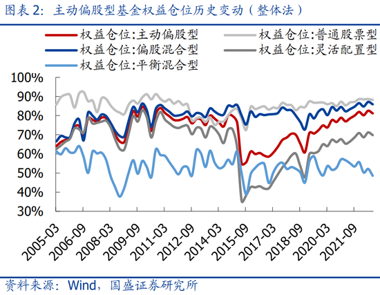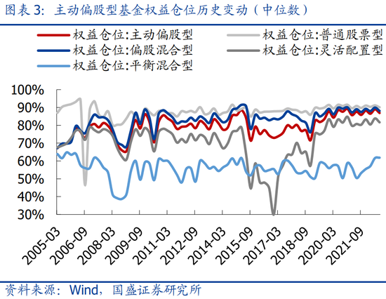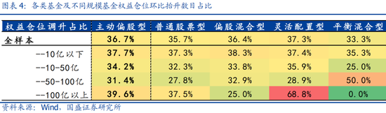 权益仓位普遍调降,但仍处历史高位。整体法视角下,主动偏股型基金权益仓位降低1.36%,将至81.20%,但仍处于近10年高位。其中普通股票型、偏股混合型、灵活配置型和平衡混合型基金的权益仓位分别达到88.21%(-0.47%)、85.92%(-1.25%)、69.82%(-1.41%)和48.59%(-3.57%)。中位数视角下,主动偏股型基金权益仓位三季度环比下降2.07%,达到86.89%,仍略高于今年一季度水平。其中普通股票型、偏股混合型、灵活配置型和平衡混合型基金的权益仓位分别达到90.08%(-1.06%)、88.05%(-1.85%)、81.65%(-2.19%)和61.83%(+0.24%)。此外,结合基金规模对比,权益加仓基金的占比约30%-40%,较高规模灵活配置型及平衡混合型基金加仓意愿较强。