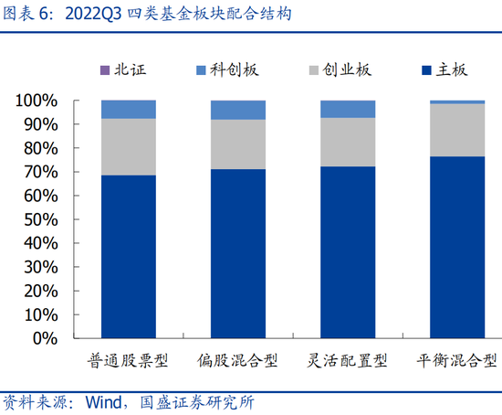 具体到各类基金层面看,加仓科创与减仓主板是各类基金共识,但创业板仓位调整仍有分歧,股票型与偏股混合型小幅加仓,而灵活配置型小幅减仓。截止三季度末,普通股票型基金主板、创业板、科创板、北交所仓位分别为68.6%、23.8%、7.7%、0.1%;偏股混合型基金主板、创业板、科创板、北交所仓位分别为71.1%、20.9%、7.9%、0.1%;灵活配置型基金主板、创业板、科创板、北交所仓位分别为72.3%、20.4%、7.3%、0.1%;平衡混合型基金主板、创业板、科创板、北交所仓位分别为76.5%、22.0%、1.5%、0.0%。