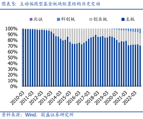 板块方面,主板仓位新低,科创板续创新高。三季度基金主板仓位明显回落,较二季度环比降低2.1%,创业板与北交所仓位相对稳定与二季度大致持平,科创板仓位再创新高。截止三季度末,主动偏股型基金的主板、创业板、科创板和北交所仓位分别达到71.1%、21.2%、7.7%和0.1%。