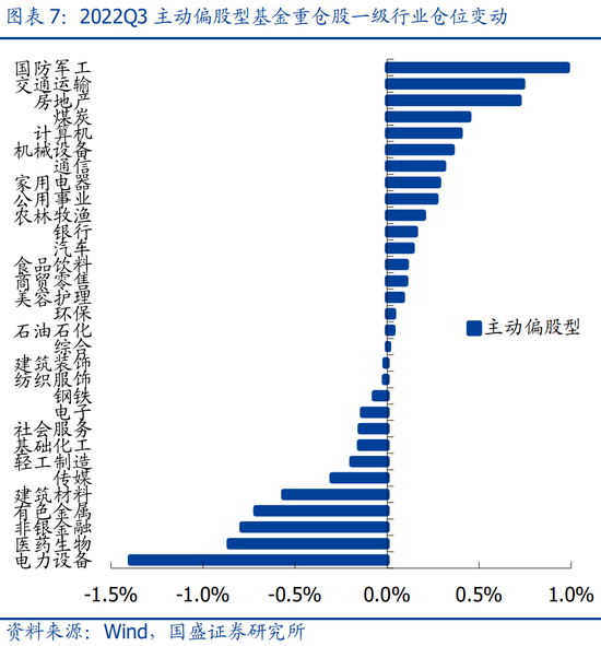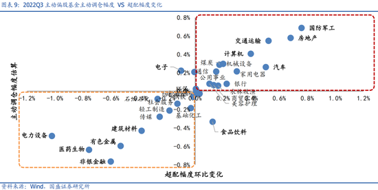剔除涨跌幅效应后,军工、地产、交运、计算机和汽车获增持居前,电力设备、非银、医药、有色和建材遭减持居多。三季度市场震荡趋弱,除煤炭外各行业收跌,剔除涨跌幅效应重点参考两个维度,其一,以行业指数表现为参照,估算基金主动调仓幅度,结果显示国防军工、房地产、交通运输、计算机和机械设备主动加仓幅度居前,分别约主动加仓0.69%、0.58%、0.55%、0.41%和0.30%,而非银金融、医药生物、有色金属、电力设备和建筑材料遭主动减仓居多,分别约主动减仓0.76%、0.64%、0.59%、0.49%和0.43%;其二,结合基金行业超配幅度的边际变化观测增持意愿变化,结果显示国防军工、房地产、交通运输、汽车和计算机获增持居前,超配幅度分别增加0.76%、0.68%、0.52%、0.50%和0.40%,而电力设备、医药生物、非银金融、有色金属和建筑材料减持意愿较强,超配幅度分别降低1.02%、0.76%、0.60%、0.53%和0.38%。综合两个视角,预计军工、地产、交运、计算机和汽车获净增持幅度居前,而电力设备、医药生物、非银金融、有色金属和建筑材料遭净减持幅度居多。