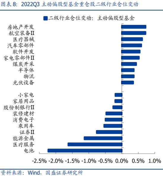 三季度基金配置由重仓向外扩散。从绝对仓位变动来看,一级行业中军工、交运、地产、煤炭和计算机仓位提升居前,分别环比增加0.98%、0.74%、0.72%、0.44%、0.40%,而电力设备、医药生物、非银金融、有色金属和建筑材料仓位回落居多,分别环比降低1.40%、0.86%、0.79%、0.71%、0.56%。二级行业中,房地产开发、航空装备、医疗器械、汽车零部件和软件开发仓位提升居前,分别环比增加0.72%、0.72%、0.62%、0.59%和0.35%,而电池、医疗服务、能源金属、证券和乘用车仓位回落居多,分别环比降低2.23%、1.62%、1.14%、0.76%和0.54%。