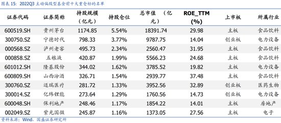 持股集中度小幅回落,重仓结构相对稳定。截至三季度末,公募前20、前50和前100重仓股持股占比较上季环比回升,分别达到31.4%(前值34.6%)、47.0%(前值50.7%)和61.6%(前值65.2%),降至2019年以来的新低,个股层面的持股“抱团”持续趋弱。从重仓股层面看,贵州茅台继续位列第一大重仓,其余前十大重仓股仍主要集中在医药消费和科技制造领域,本期迈瑞医疗、保利地产和紫光国微新晋前十大重仓。截止三季度末,前五大重仓股依次为贵州茅台、宁德时代、泸州老窖、五粮液和隆基股份。