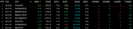下跌方面,从申万一级行业指数来看,汽车、农林牧渔、建筑材料、基础化工、电力设备以及综合行业板块均跌超4%。整体来看,赛道股继续调整,锂电池、光伏等方向领跌,多氟多、宝馨科技、山东章鼓等多股跌停,宁德时代跌超6%。养殖股再度下挫,湘佳股份、民和股份跌停。