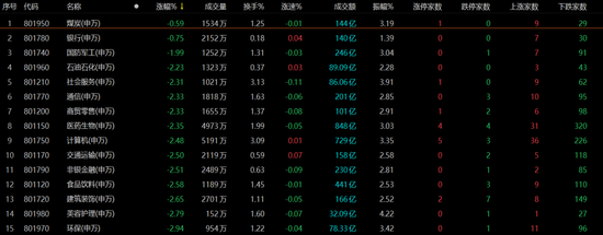 今日,31个申万一级行业全部绿盘收跌,市场呈普跌格局,个股交投情绪继续维持冰点状态。从申万一级行业指数来看,煤炭、银行、国防军工板块相对抗跌。