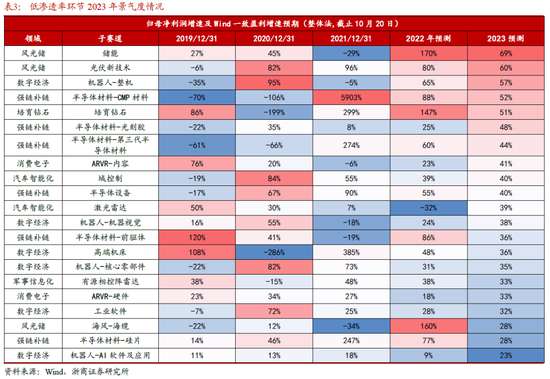 结合Wind盈利预测统计相关赛道的2023年景气,可以发现:一方面,低渗透率赛道23年盈利增速预期多超过30% ,其中风光储(储能、光伏新技术)、强链补链(CMP材料、光刻胶)、工业智能化(机器人整机)、培育钻石23年Wind一致盈利预期增速更是超45%;另一方面,工业智能化、汽车智能化等智能化方向内赛道23年盈利增速多环比22年提升,例如机器视觉、工业软件、机器人核心零部件、域控制和激光雷达等赛道。