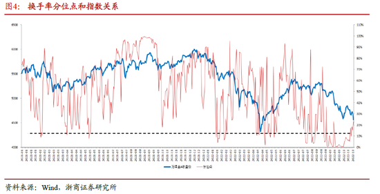 换手率分位数与市场短期走势有着较强的相关性,当换手率分位数接近或低于10分位后,对短期市场转折点有一定领先性,如2021年4月6日、2022年1月24日、2022年4月19日,2022年7月25日。