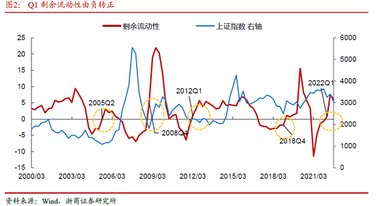其二,宏观环境层面,历史大底往往伴随着剩余流动性(M2同比-名义GDP同比)由负转正,如2005Q2、2008Q4、2012Q1、2018Q4均出现了剩余流动性由负转正信号,截止今年Q1剩余流动性已由负转正。