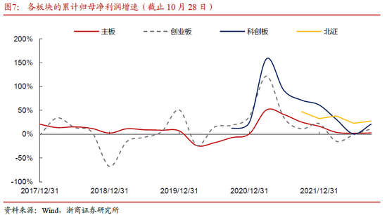 分板块来看,披露口径下以整体法统计,科创板前三季度归母净利润增长21%,环比中报增速提升20个百分点,在各板块中脱颖而出。