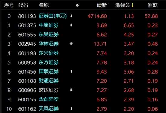 今日早盘,券商板块出现异动。中原证券早盘股价一度逼近涨停,截至午盘上涨6.65%,东吴证券、华林证券等涨超3%。申万证券行业整体涨幅达1.13%,显著跑赢上证指数与深证成指。