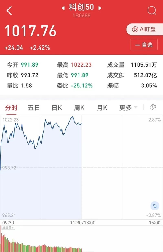 科创板无疑是今日资金追逐的焦点。科创50指数早盘低开高走,快速收复1000点整数关口,随后继续震荡冲高。截至午间休市,科创50指数报1017.76点,上涨2.42%,50只成分股中有40只录得上涨,奇安信大涨14%,睿创微纳、奕瑞科技涨超7%。