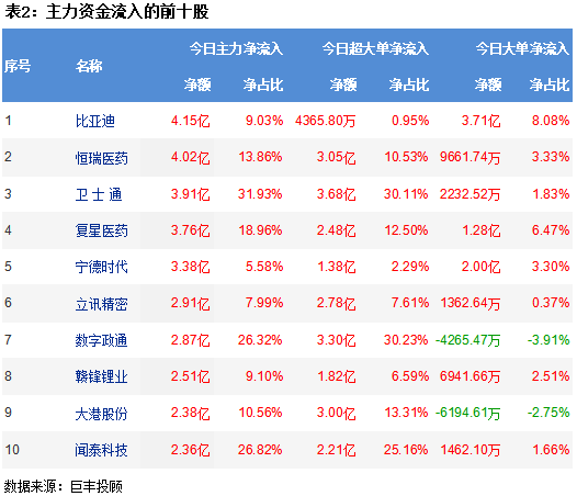 从两市个股主力资金流向来看,比亚迪获主力资金净流入4.15亿,恒瑞医药获主力资金4.02亿净流入,卫士通获主力资金净流入3.91亿,复星医药获主力资金净流入3.76亿,宁德时代获主力资金净流入3.38亿。