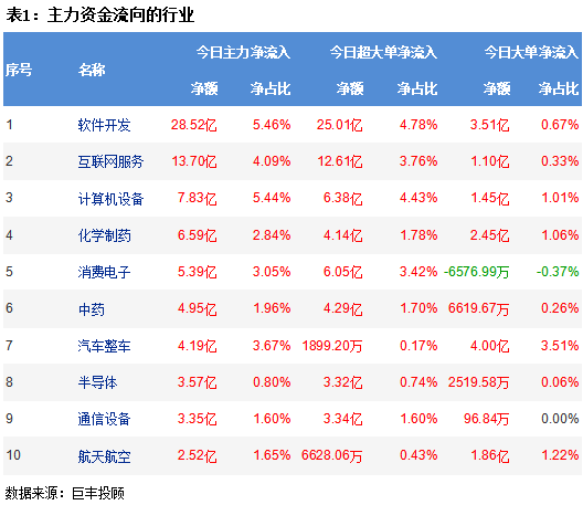 从两市行业板块资金流向来看,软件开发板块获主力资金净流入28.52亿,互联网服务板块获主力资金净流入13.70亿,计算机设备板块主力资金净流入7.83亿,化学制药板块主力资金净流入6.59亿,消费电子板块主力净流入5.39亿。