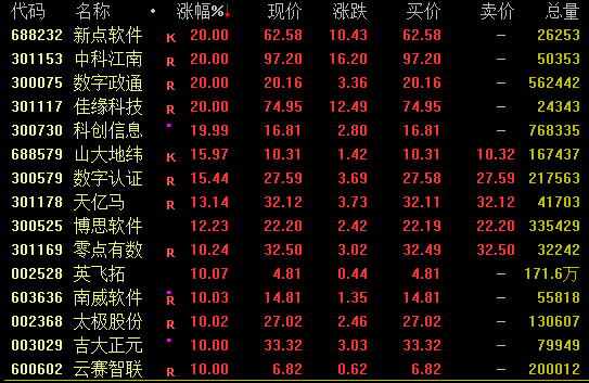 智慧政务、信创概念盘中大幅走高,截至收盘,新点软件、中科江南、数字政通、佳缘科技等多股“20cm”涨停,海光信息涨近15%,博思软件、安恒信息、零点有数等涨超10%。