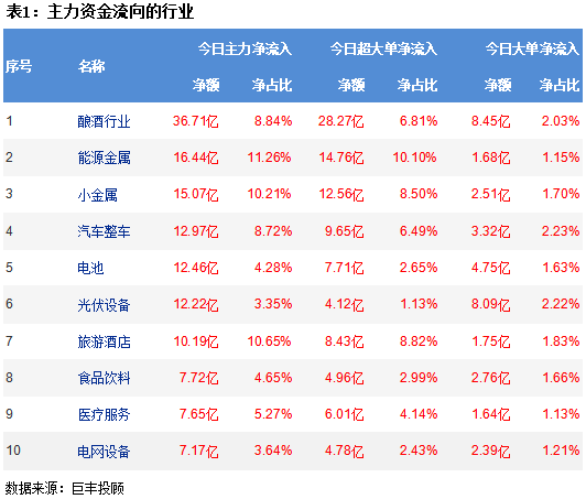 从两市行业板块资金流向来看,酿酒板块获主力资金净流入36.71亿,能源金属板块获主力资金净流入16.44亿,小金属板块主力资金净流入15.07亿,汽车整车板块主力资金净流入12.97亿,电池板块主力净流入12.46亿。