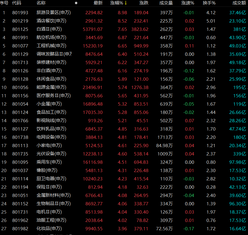无论从申万一级行业还是二级行业来看,大消费都是今日市场出现反弹的主要动力,其中旅游出行、白酒板块起到了领涨的作用。