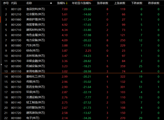 板块方面,除了国防军工微跌,其余30个申万一级行业板块全线飘红。大消费“爆发”,食品饮料板块收涨7%,社会服务、美容护理涨幅均超过5%,商贸零售、建筑材料、有色金属、电力设备涨幅超过4%,汽车、农林牧渔、非银金融、机械设备、家用电器板块涨幅超过3%。