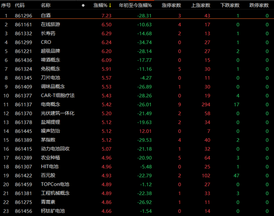 白酒、在线旅游、长寿药等消费、医药概念领涨,光伏建筑一体化、盐湖提锂、汽车一体化压铸等热门概念板块也大涨。