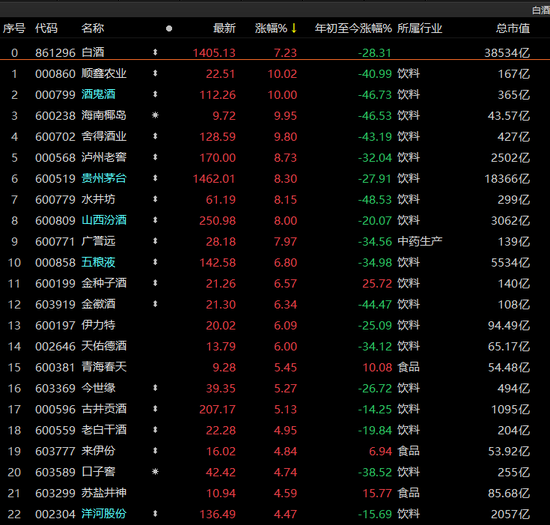 白酒概念领涨,顺鑫农业、酒鬼酒、海南椰岛涨停,舍得酒业逼近涨停,泸州老窖、水井坊、山西汾酒涨幅不低于8%。