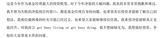 随后,他诚恳地向基民再三道歉:“对于今年净值的大幅回撤,我真的非常非常抱歉和难过,我不想为失败的净值找任何借口,都是基金经理自身的问题。也希望各位投资者能够了解自己的想法。”