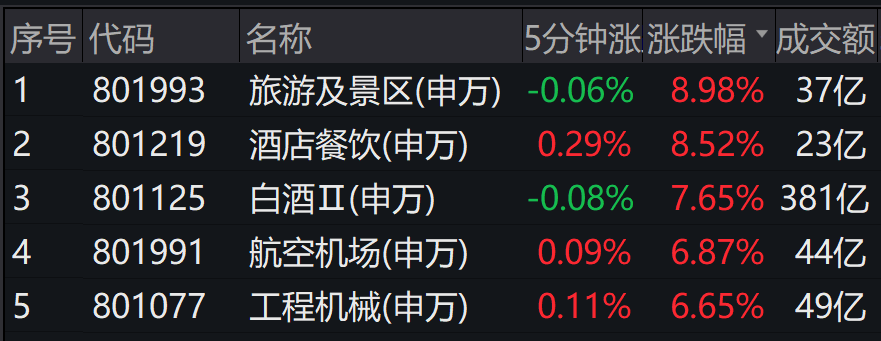 截至当日收盘,食品饮料板块大涨7%,领涨申万一级行业。旅游及景区、酒店餐饮均涨超8%,白酒涨超7%,在申万二级行业中涨幅居前。