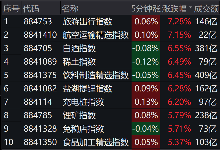 Wind数据显示,大消费相关概念板块涨幅居前。截至当日收盘,旅游出行指数(884753)、航空运输精选指数(8841410)均涨超7%,白酒指数(884705)、饮料制造精选指数(8841375)涨超6%,免税店指数(8841328)、食品加工精选指数(8841350)也涨超5%。