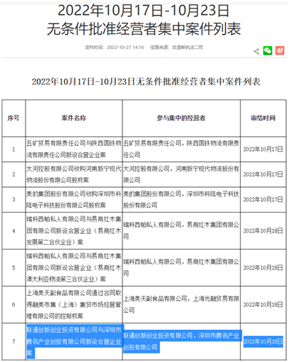 消息面上,国家市场监管总局官网发布的《2022年10月17日-10月23日无条件批准经营者集中案件列表》显示,联通创新创业投资有限公司与深圳市腾讯产业创投有限公司新设合营企业案获无条件批准,审结时间为10月18日。