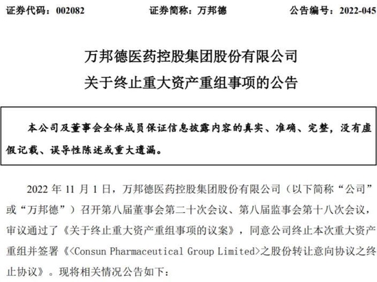 11月1日晚,万邦德披露公告称,公司决定终止本次重大资产重组,即终止收购康臣药业集团有限公司(Consun Pharmaceutical Group Limited)(下称“康臣药业”)29.5%股权。