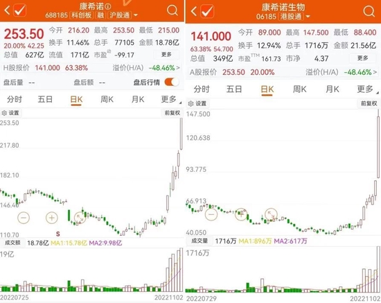 康希诺A、H股日线走势