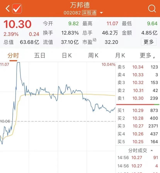 11月2日一早,万邦德盘中一度触及涨停。截至收盘,公司股价回落至10.30元,涨幅2.39%。