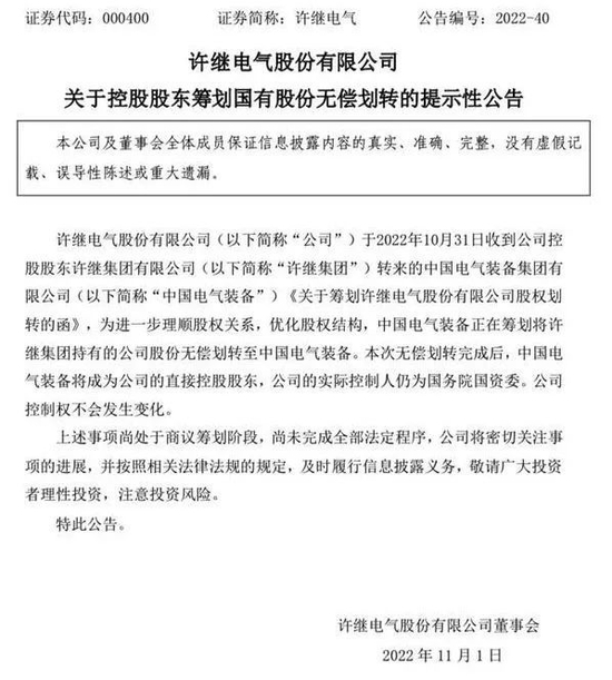10月31日,中国西电公告称,为进一步理顺股权关系,优化股权结构,中国西电持有的中国西电股份,将无偿划转至中国电气装备集团。本次无偿划转完成后,中国西电的直接控股股东将变为中国电气装备集团,实际控制人仍为国务院国资委,控制权不会发生变化。同日,许继电气、平高电气先后发布公告称,中国电气装备将成为公司的直接控股股东。标志着千亿级电力装备央企中国电气装备集团的重组再次迎来实质性进展。