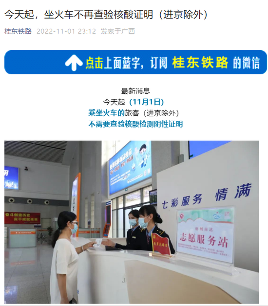 今天起(11月1日)桂东铁路乘坐火车的旅客(进京除外),不需要查验核酸检测阴性证明。但进京旅客须持北京健康宝绿码和48小时内核酸检测阴性证明方可进站乘车,其他旅客需出示健康码绿码、测温进站。
