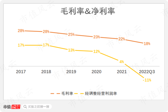 盈利能力方面,毛利率从上市之初的28%降至2022Q3的18%,经调整经营利润率则更惨,2021年仅4%,今年前三季度则是-11%,表明公司当前主业赚钱能力不足。