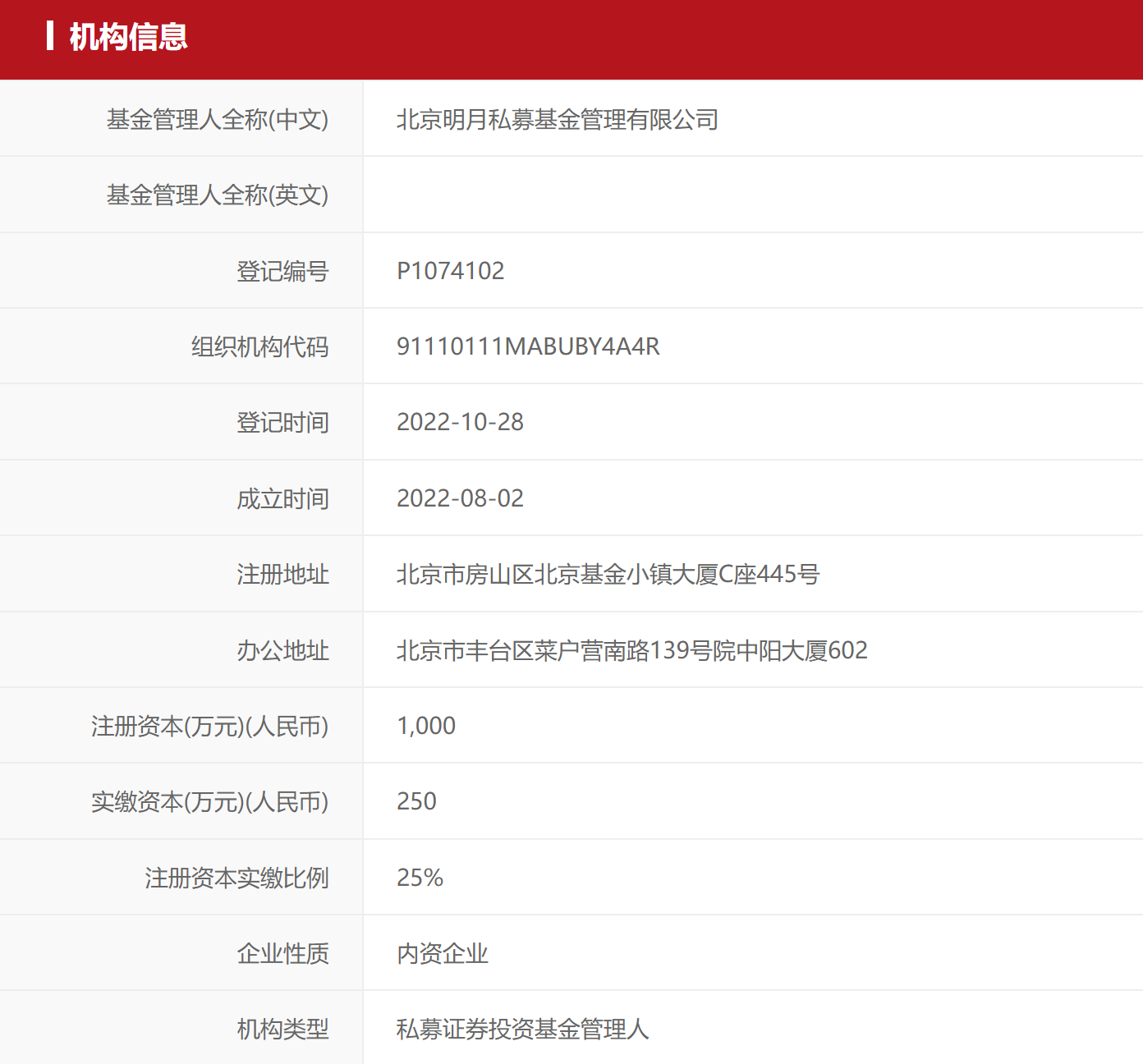 10月28日,一家名为北京明月私募的私募基金管理人在中基协完成备案。备案信息显示,该机构成立于今年8月2日,注册资本1000万元,全职员工6人。