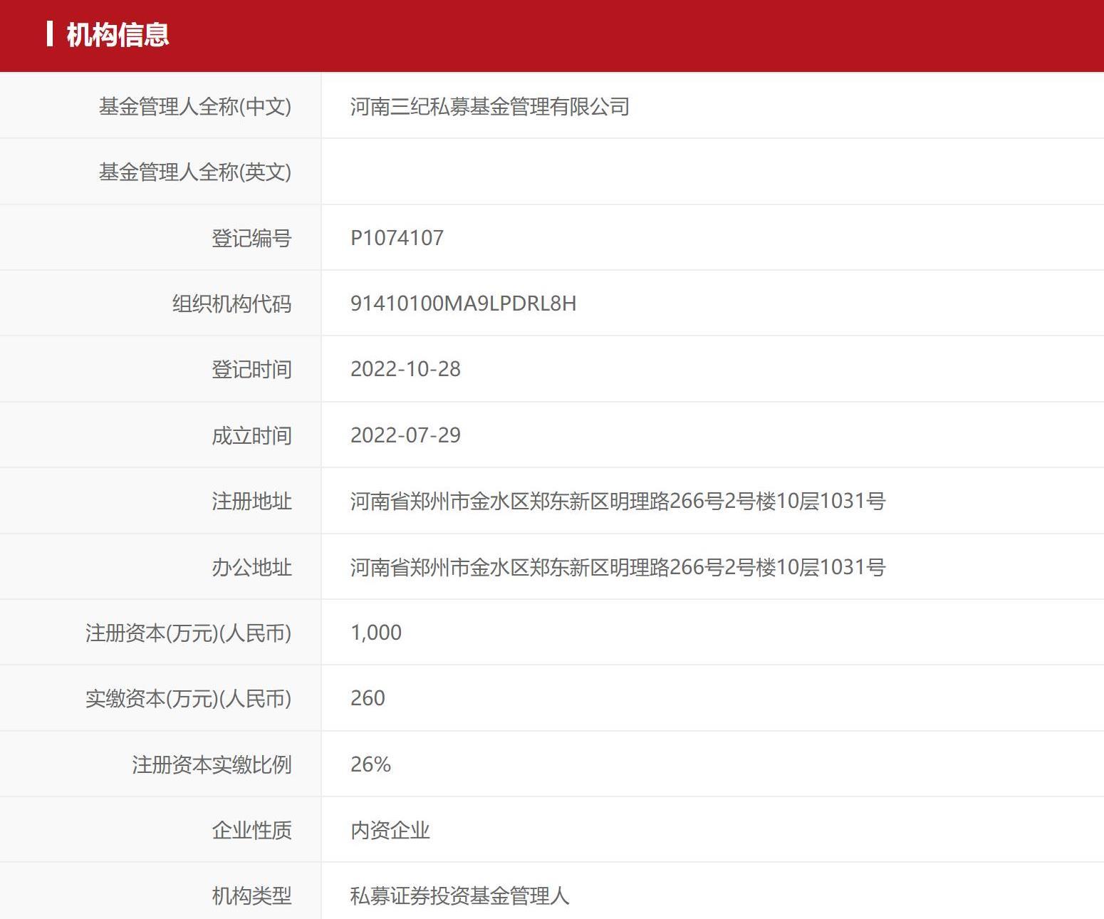另一家引起记者注意的私募基金管理人是今年7月底成立、10月28日完成备案的三纪私募。中基协备案信息显示,三纪私募注册资本1000万元,注册地址和办公地址都在河南省郑州市金水区,全职员工5人,也是一家私募证券投资基金管理人。