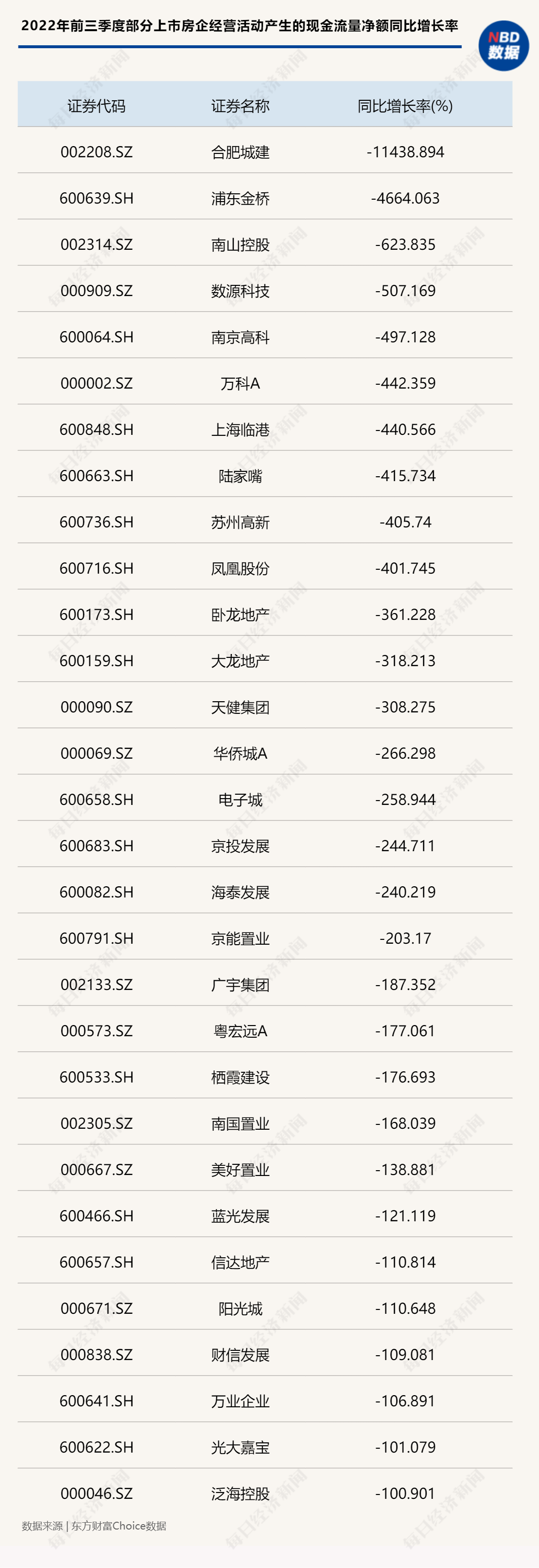 即便大多数房企已大幅放缓拿地节奏,但受限于融资端的紧缩和房地产市场销售面的压力,现金流的稳定性和管理仍然面临“大考”。据Choice数据,前三季度有44家房企经营活动产生的现金流量净额为负,56家房企为负增长。