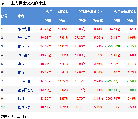 从两市行业板块资金流向来看,酿酒板块获主力资金净流入47.21亿,光伏设备板块获主力资金净流入36.93亿,能源金属板块主力资金净流入24.67亿,汽车整车板块主力资金净流入19.23亿,电池板块主力净流入18.01亿。