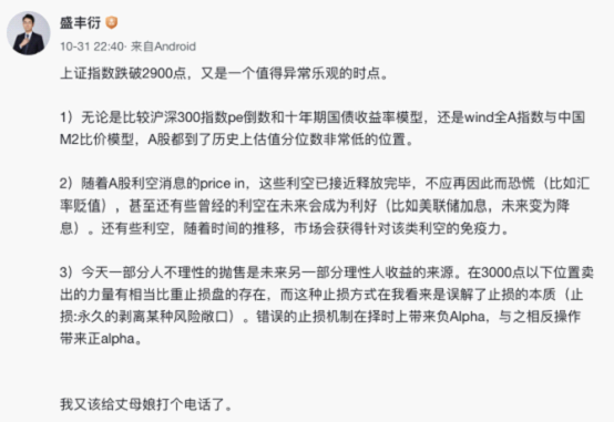 “把丈母娘一年退休金亏没了”的基金经理也称敢打电话了,西部利得基金量化投资总监盛丰衍表示,当前又是一个值得乐观的时点,无论用哪种模型测算,A股都到了历史估值低位。在3000点以下位置卖出的力量,还有相当比重止损盘的存在。盛丰衍认为,目前一部分人不理性的抛售,就是未来另一部分理性人收益来源。随着A股利空消息接近释放完毕,不应再恐慌,甚至有些利空在未来将会成为利好,比如美联储加息未来变为降息。最后,盛丰衍称“我又该给丈母娘打个电话了”。