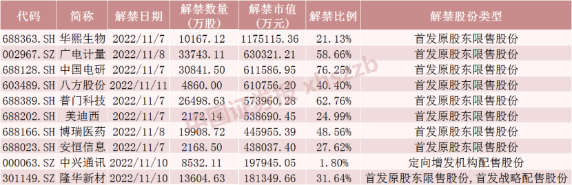 具体来看,Wind数据显示,华熙生物11月7日将解禁1.02亿股,广电计量11月8日将解禁3.37亿股,中国电研11月7日将解禁3.08亿股,八方股份11月11日将解禁4860万股。上述四家公司将解禁股份均为首发原股东限售股份。