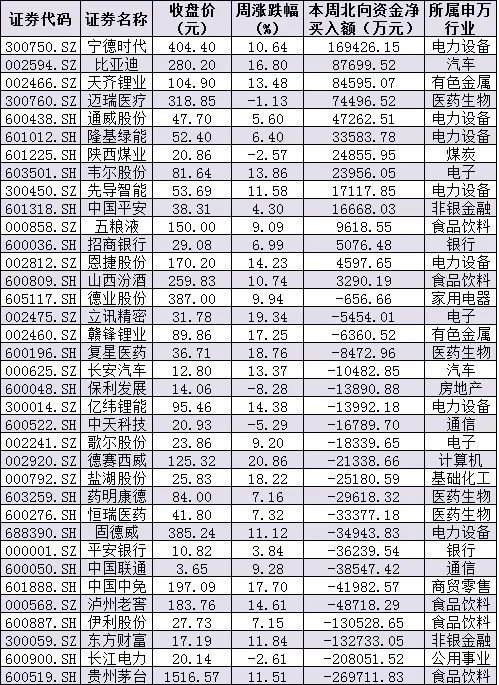 资金方面,周五,北向资金大幅净买入99.93亿元,创9月9日以来新高。本周北向资金累计净卖出金额达50.11亿元。从前十大成交活跃股来看,本周,宁德时代、比亚迪、天齐锂业、迈瑞医疗等4只个股,北向资金净买入金额均超7亿元。另外,贵州茅台、长江电力、东方财富、伊利股份等个股遭北向资金净卖出金额均超10亿元。