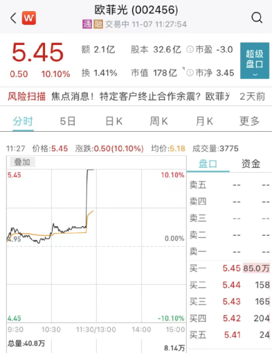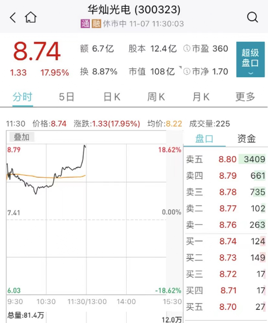 京东方将入主华灿光电引关注。今日午盘,华灿光电一度冲高至18%,股价报8.74元,总市值为108亿元。