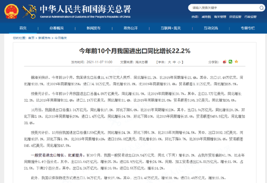海关总署:今年前10个月